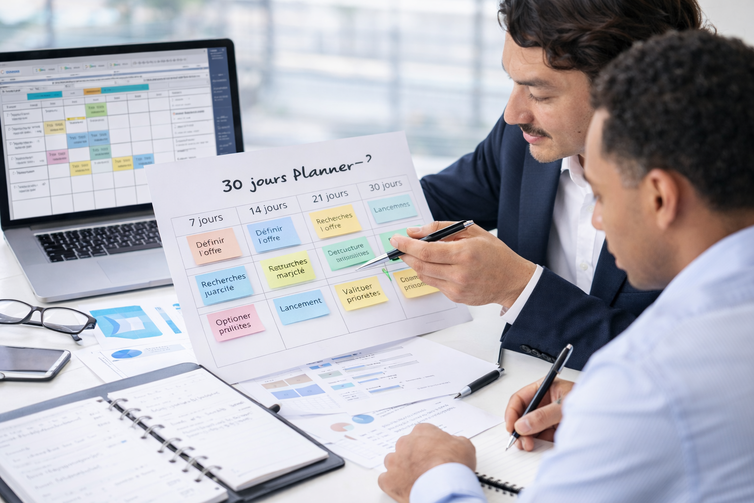 En 30 jours, vous passez du cadrage au lancement avec un accompagnement structuré pour valider vos choix, poser vos bases et enclencher vos premières actions concrètes.